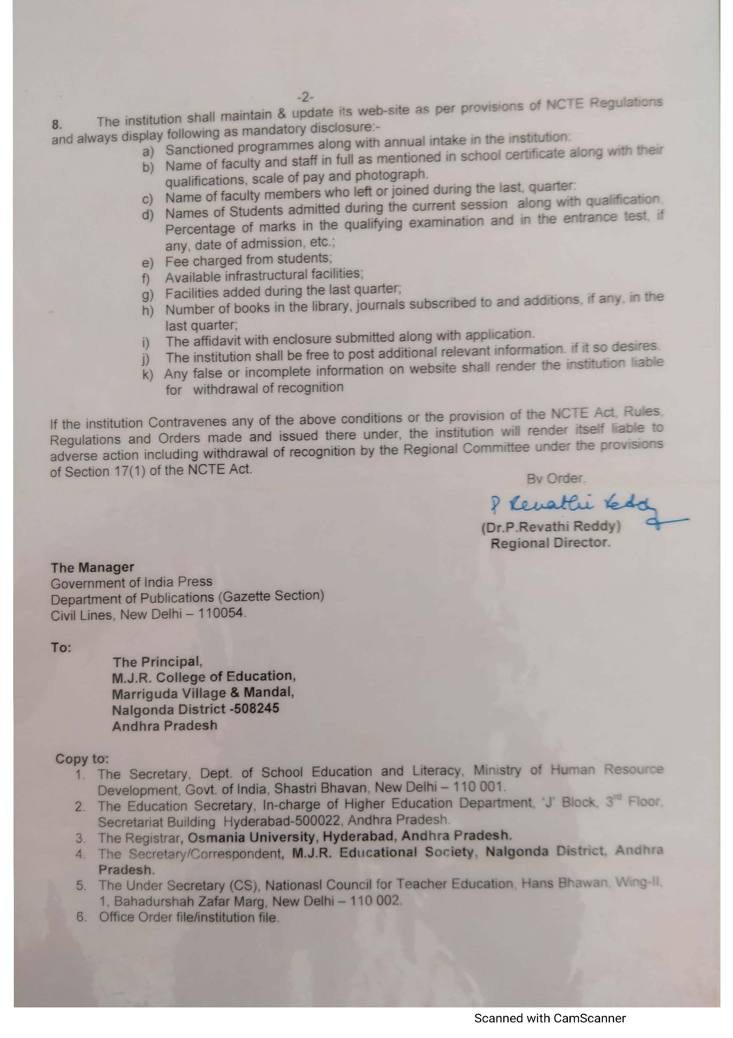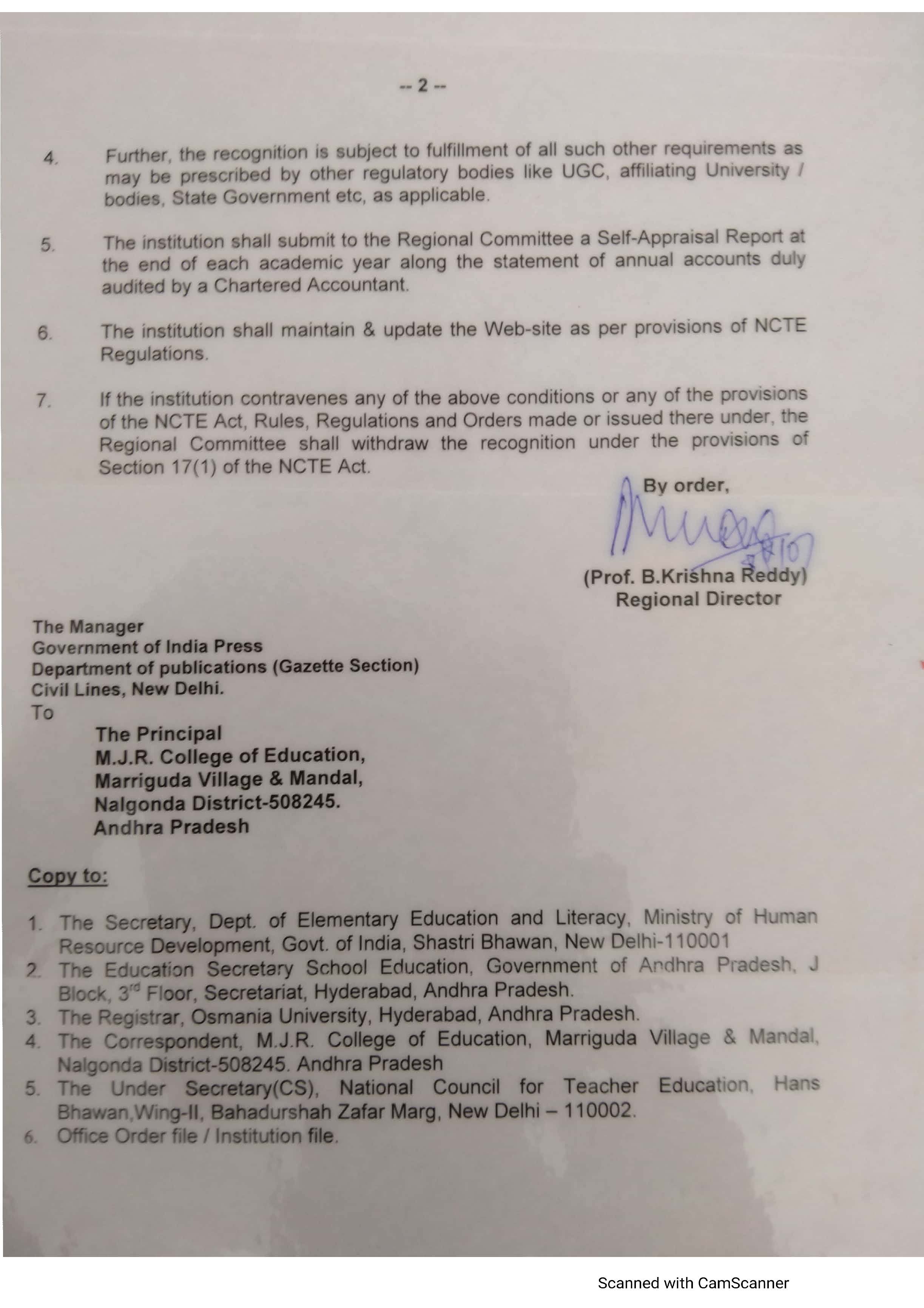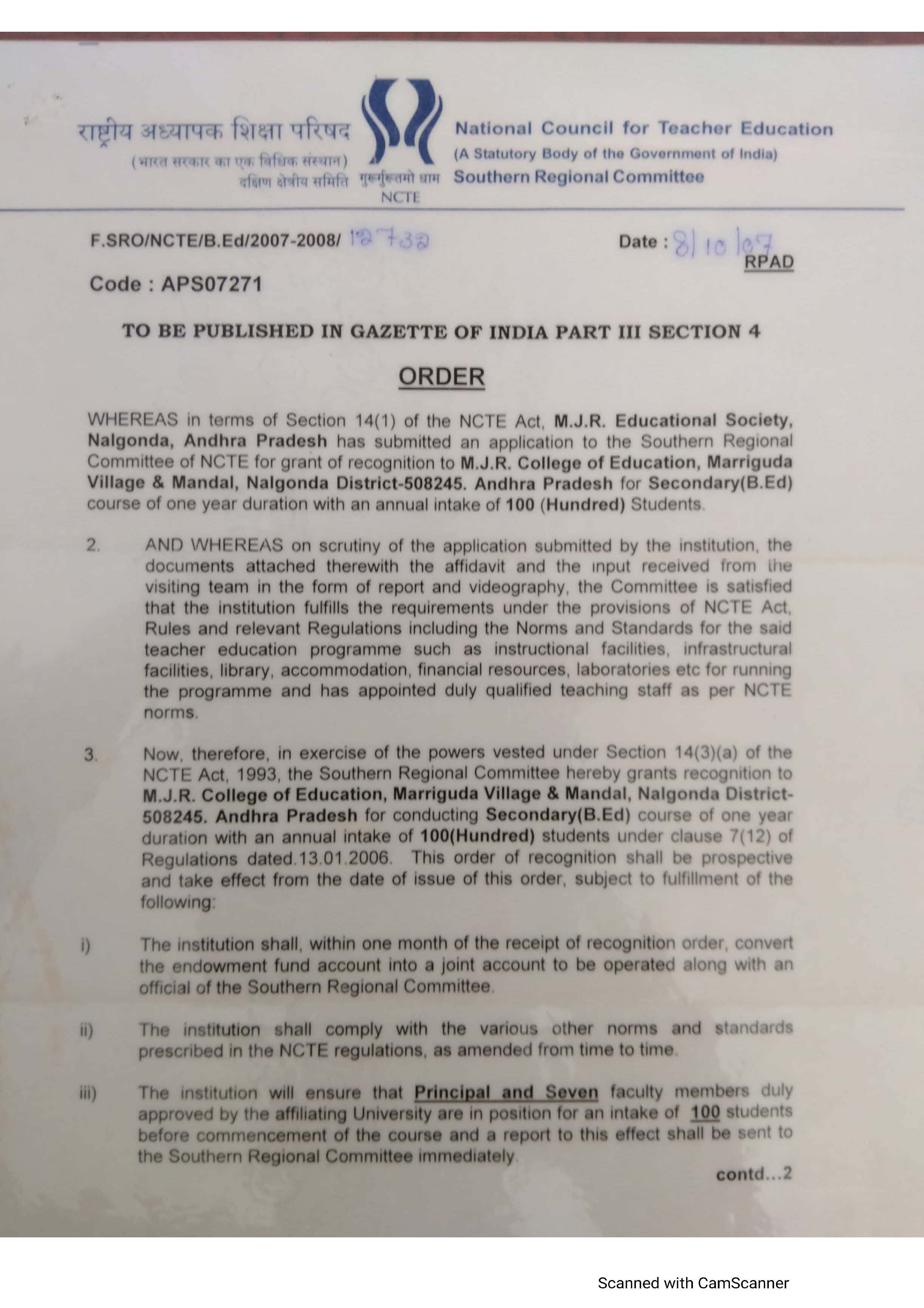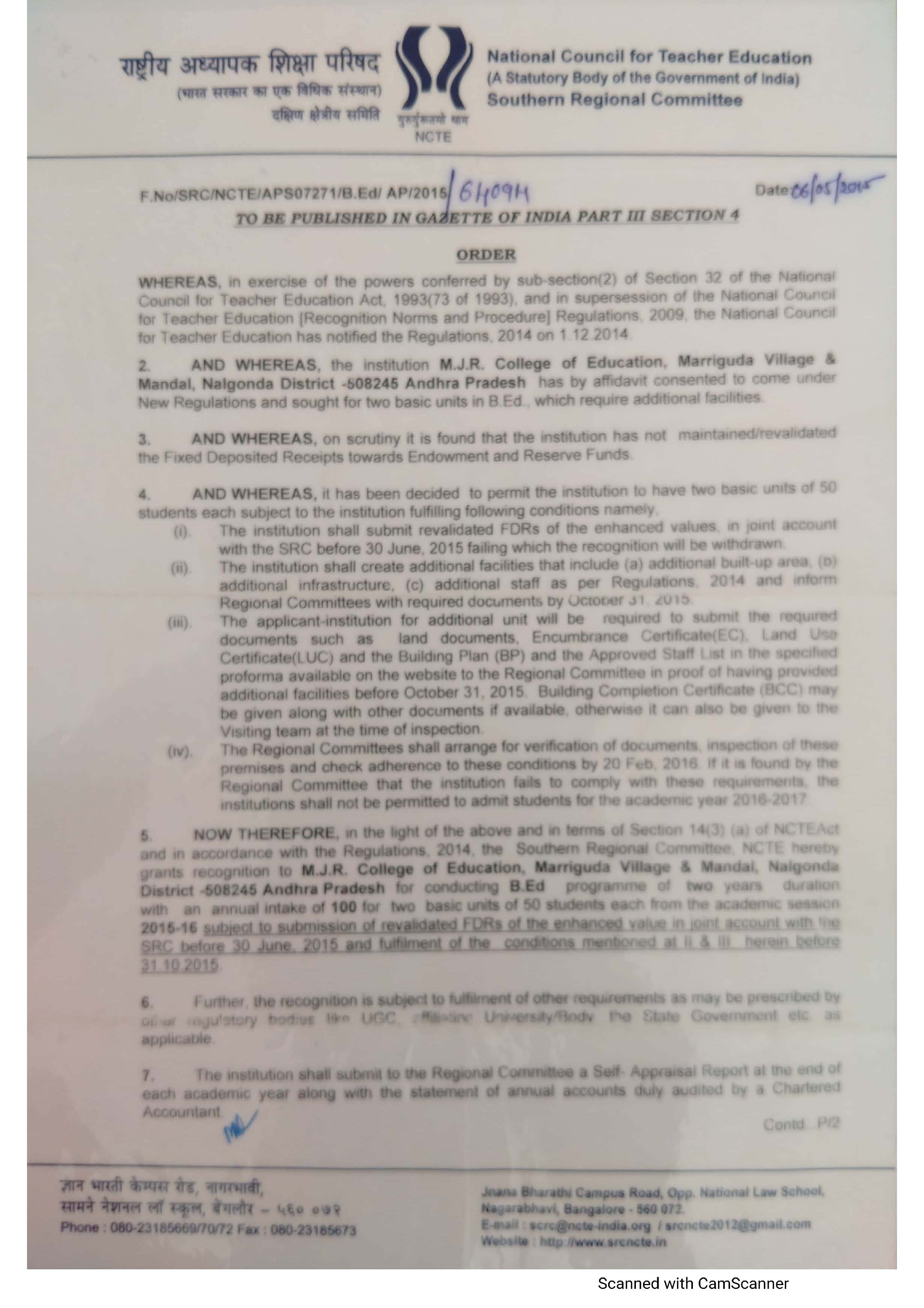 NCTE Permission letter For MJR College of Education